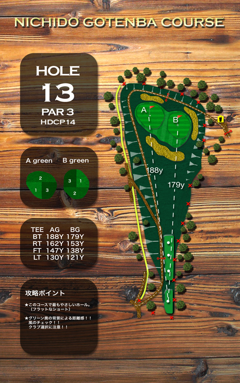 ・このコースで最もやさしいホール。(フラットなショート) ・グリーン奥の背景による距離感!!風のチェック!!クラブ選択に注意!!