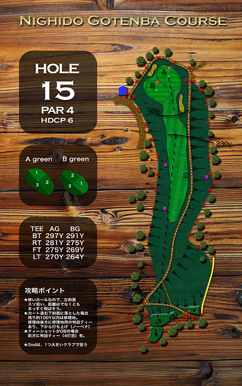 ・狭いホールなので、左斜面スソ狙い、距離はでなくともまっすぐ飛ばそう。 ・カート道右下斜面に落とした場合、残り約100Y以内は修理地。修理地後方に 修理地用の特設ティー有、下から打ち上げ(ノーペナ) ・ティーショットがOBの場合、前方に特設ティー(4打目)有。 ・2ndは、1つ大きいクラブで狙う。
