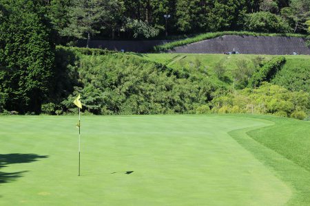 ・谷越えのショート。 ・手前がラテラルウォーターハザード。落とした場合は、左前方に指定ドロップ区域有 (1打付加) ・グリーンの外回りのネットを越えると1ペナーとなります。 ・グリーンは受けの強い3段グリーンとなっており、奥に乗せると下りの傾斜がキツイ ので、手前の方から攻めるのがベター。